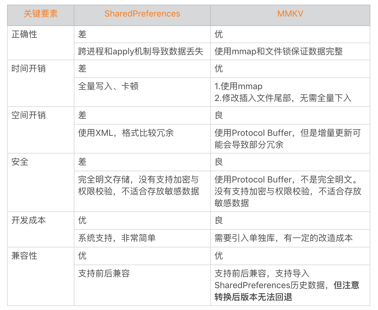 下面是MMKV对于SharedPreferences的“六要素”对比。