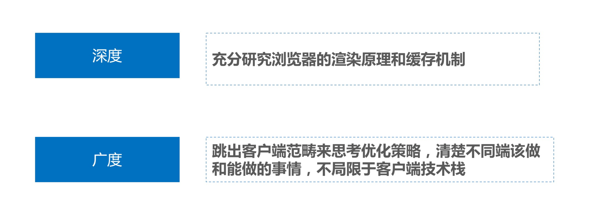 这个时候我们第一步就要跳出自身客户端的角色限制,从更为全局的角度看问题、思考问题。你需要明白,客户端的实现只是其中一小块内容而已。假如你接到一个提升页面打开速度的任务,极致优化的基础是我们能深入研究浏览器的渲染原理和缓存机制,但是前端和后端能够做些什么,又应该做些什么呢?除此之外,页面哪里产生、如何发布、发布到哪里、如何下载、如何解析、如何渲染、如何衡量和监控页面的性能,这些全部都是我们需要思考的问题。