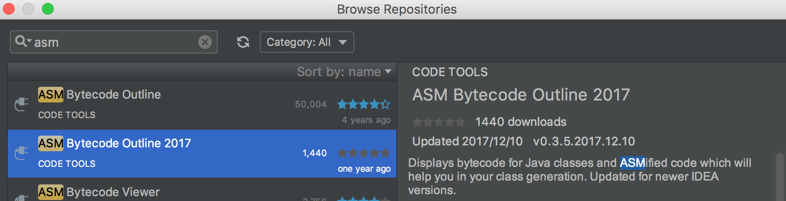 在上一期里,Eateeer同学留言说得非常好,提到了一个工具,我也在使用这个工具帮助自己理解ASM。安装“ASM Bytecode Outline”也非常简单,只需要在Android Studio中的Plugin搜索即可。