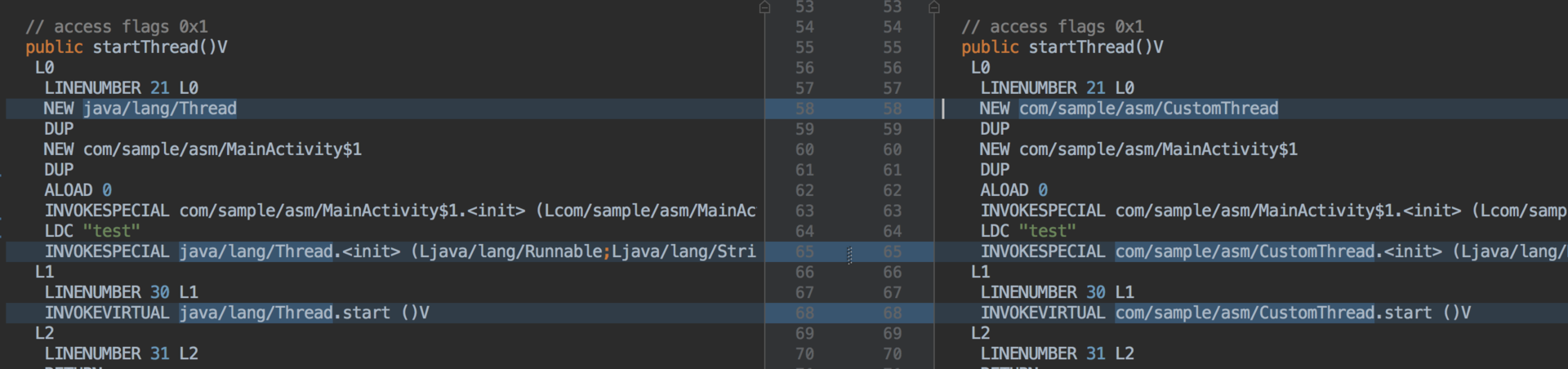 不过这也是一个相对来说坑比较多的情况,你可以提前考虑一下可能会遇到什么状况。同样我们通过修改MainActivity的startThread方法里面的Thread对象改变成CustomThread,通过ASM Bytecode Outline看看在字节码上面的差异: