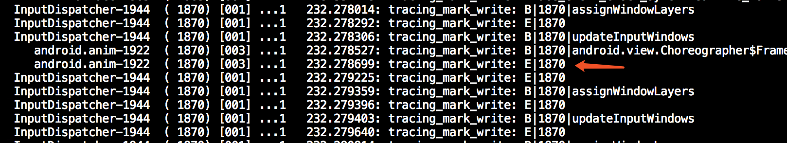 所以我们可以认为B下面紧跟的E就是事件的结束标志,但很多情况下我们会遇到上面日志中所看到的两个B连在一起,紧跟的两个E我们不知道分别对应哪个B。此时我们需要看一下产生事件的CPU是哪个,并且看一下产生事件的task_pid是哪个,也就是最前面的InputDispatcher-1944,这样我们就可以对应出来了。