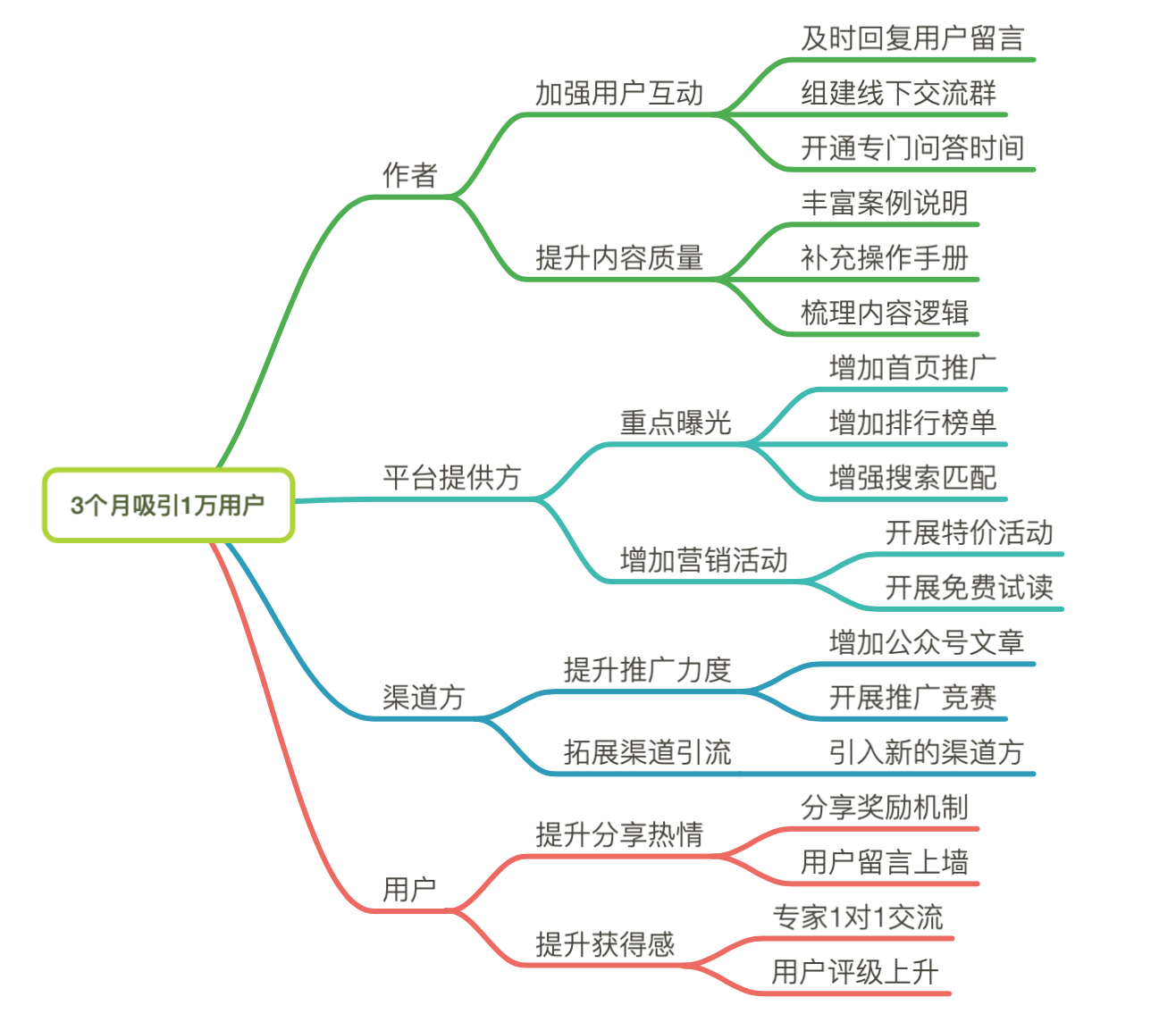 比如,一个专栏希望可以在上线3个月内吸引1万名用户,那么,这个Why,也就是最核心的业务目标。为了达成这个目标,需要影响的角色包含哪些呢?其实就包含了作者、平台提供方、渠道方和最终用户。需要对他们施加哪些影响呢?对作者来说,需要快速地回答用户的问题,提升内容的质量;对平台来说,需要对专栏进行重点曝光,增加营销活动;对渠道方来说,需要提高推广力度和渠道引流;对于用户来说,增加分享有礼、免费试读和个人积分等活动。