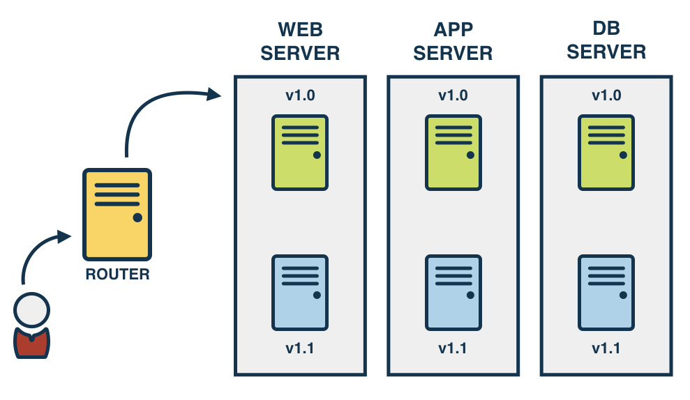 一般来说,这种方式的实现成本比较高。因为有两套一模一样的环境,只有一套用于真正地提供线上服务。为了减少资源浪费,在实际操作中,另外一套环境可以当作预发布环境使用,用来在上线之前验证新功能。另外,在这种模式下,数据库普遍还是采用同一套实例,通过向下兼容的方式支持多个版本的应用。