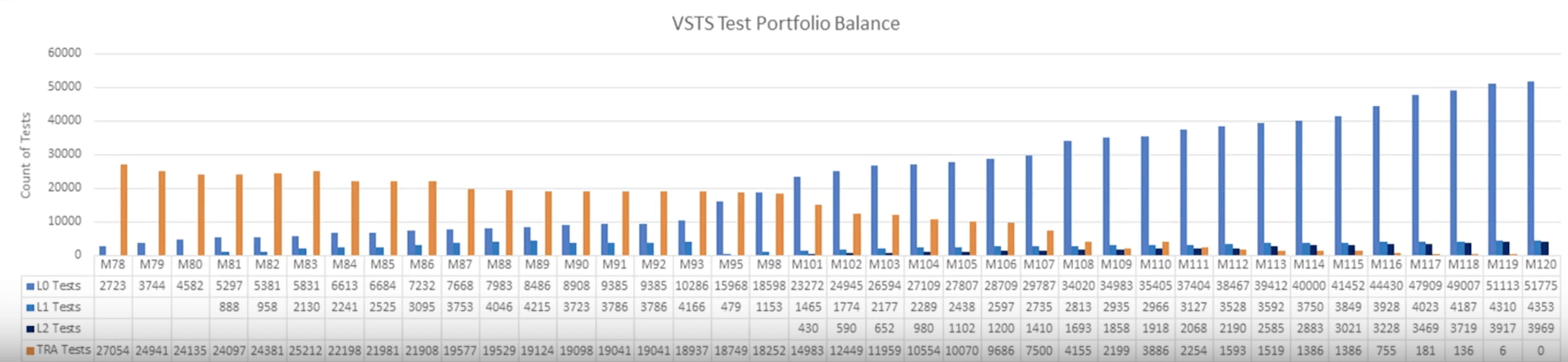 你可以看到,每日测试的数量不断减少,L0级别的测试不断增多,到后来,L1/L2级的测试也相对稳定下来。你要知道,这40多个迭代可是花了将近3年的时间。如果以后谁再跟你说“3个月就能搞定单测”,你可千万别跟他聊天。