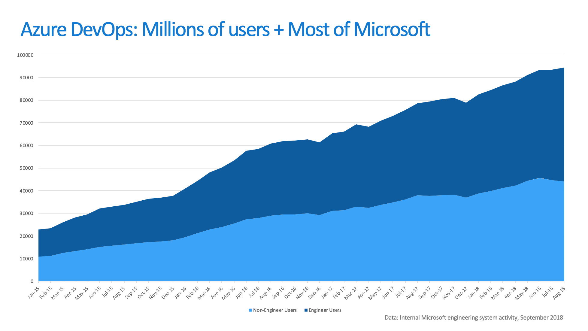 在接下来的几年里面,1ES团队推动VSTS(也就是现在的Azure DevOps)成为了微软内部的工具平台标准,平台的用户也从最开始的几千个人增长到了后来的10万多人。