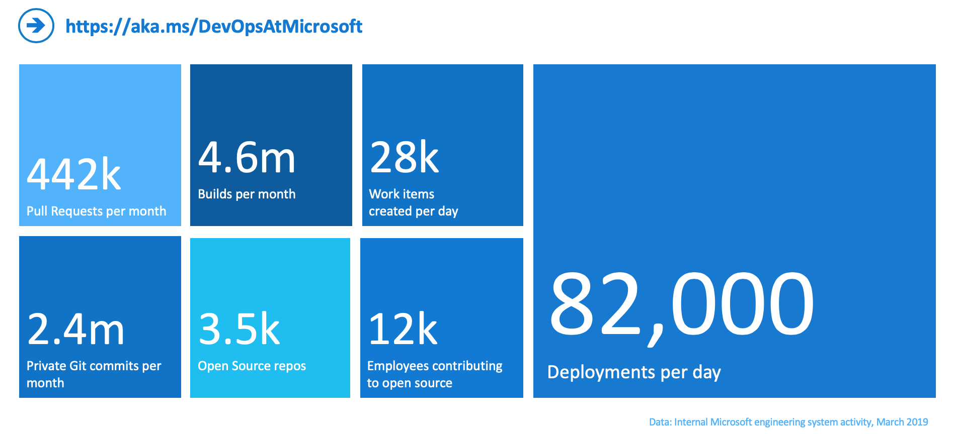 从2019年3月份的数据来看,他们每天部署82,000次、创建28,000个工作项,每个月有44万个提交请求、460万次构建和240万次的提交数量。