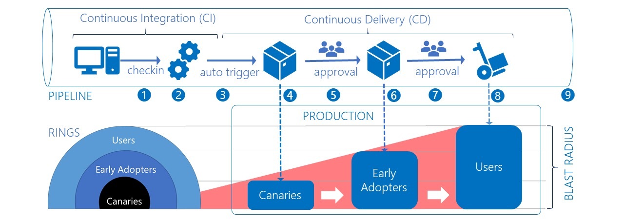 你可以看一下这幅微软开发的全景图,其中,在CD过程中,每一环的部署都需要人工确认来完成,这背后的核心理念是控制“爆炸半径”。
