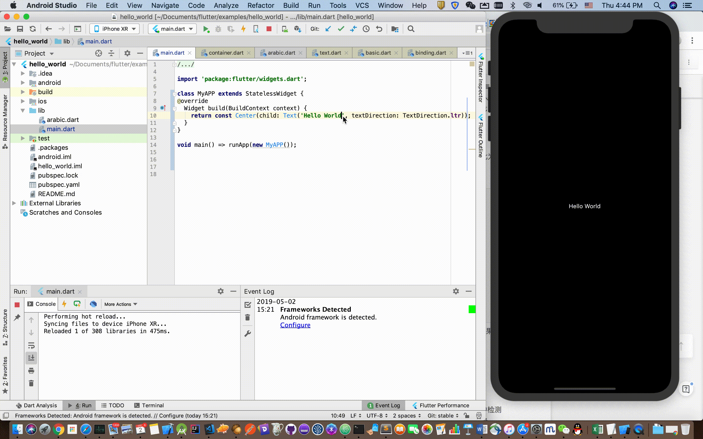 打开Flutter根目录,我们可以发现有一个examples文件夹,里面是一些基本的flutter示例。在今天这篇文章中,我会以hello_world示例为例,和你演示一下如何在模拟器和真机中运行Flutter项目。