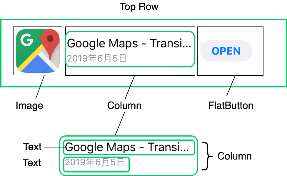 按垂直方向,我们用绿色的框把这个UI拆解为上半部分与下半部分,如图2所示。下半部分比较简单,是两个文本控件的组合;上半部分稍微复杂一点,我们先将其包装为一个水平布局的Row控件。