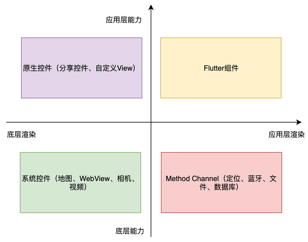 经过分析,我们终于发现,原来构建一个App需要覆盖那么多的知识点,通过Flutter和方法通道只能搞定应用层渲染、应用层能力和底层能力,对于那些涉及到底层渲染,比如浏览器、相机、地图,以及原生自定义视图的场景,自己在Flutter上重新开发一套显然不太现实。