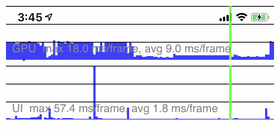 下图演示了性能图层的展现样式。其中,GPU线程的性能情况在上面,UI线程的情况显示在下面,蓝色垂直的线条表示已执行的正常帧,绿色的线条代表的是当前帧: