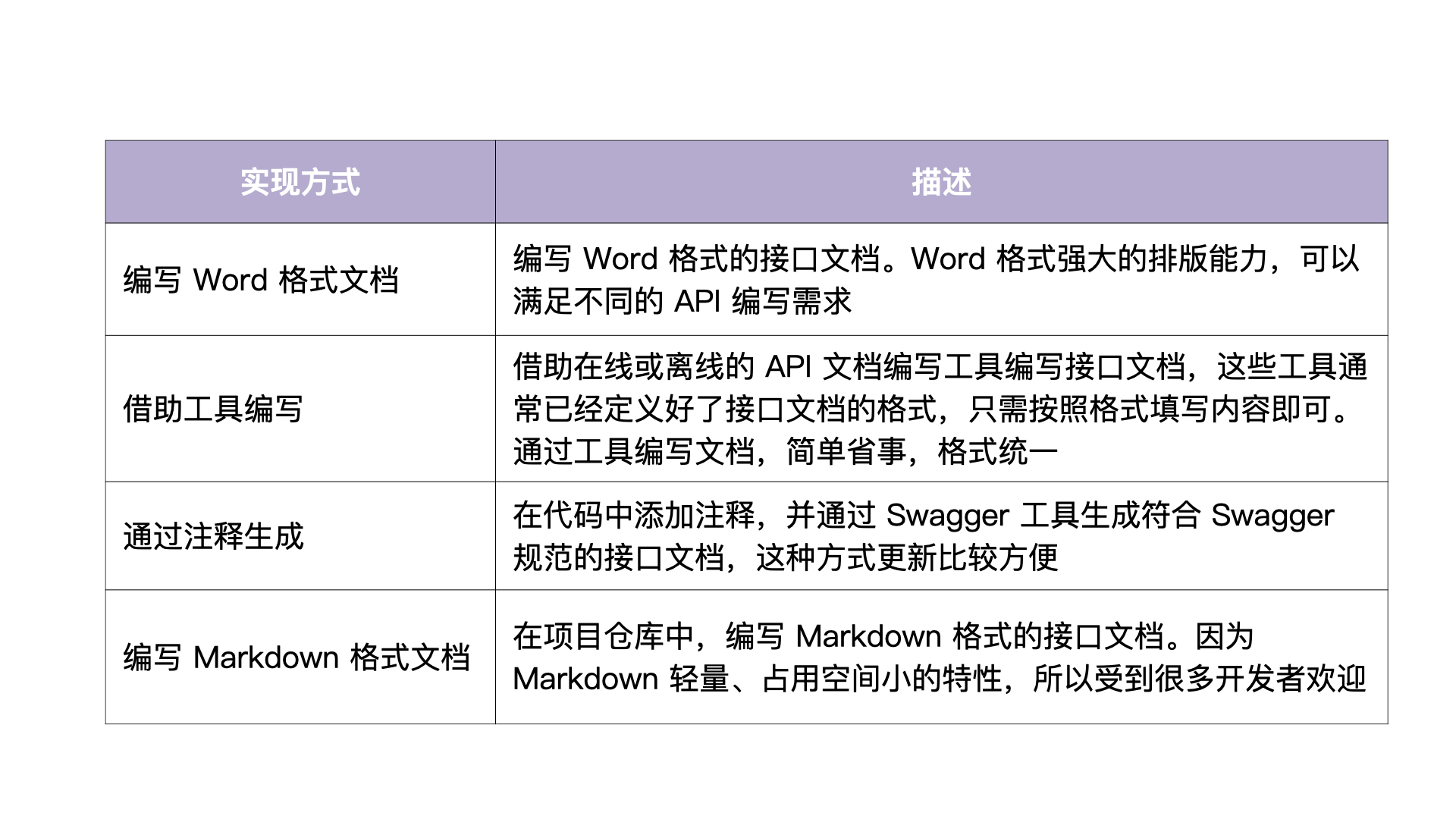 接口文档有四种编写方式,包括编写 Word 格式文档、借助工具编写、通过注释生成和编写 Markdown 格式文档。具体的实现方式见下表: