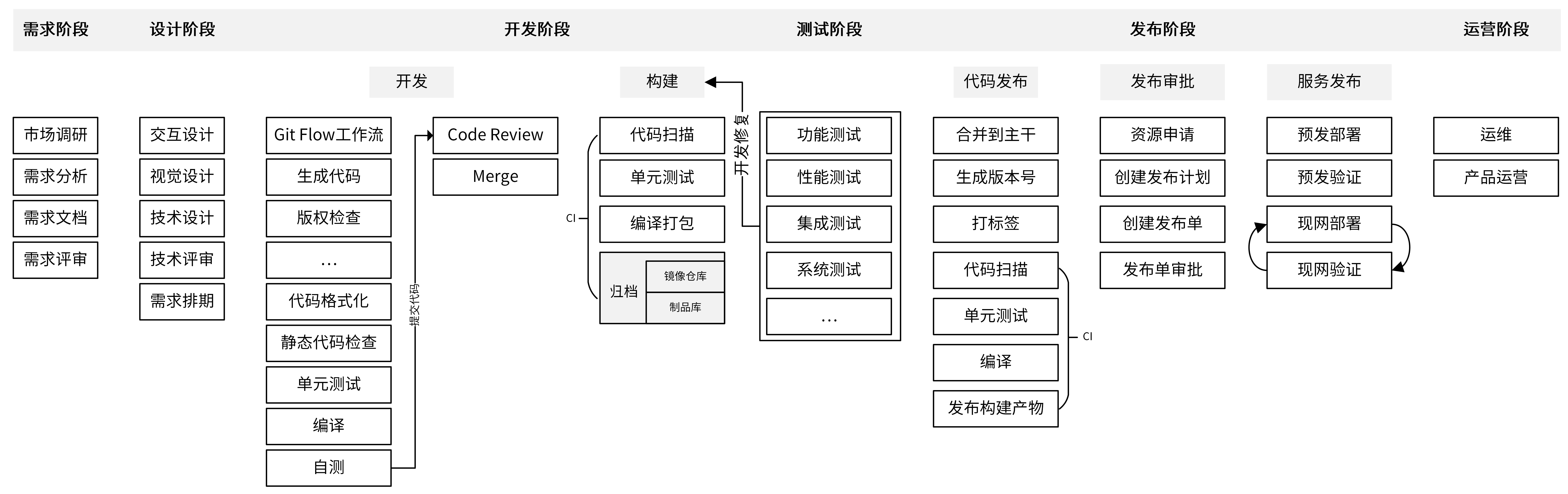 一个项目从立项到结项,中间会经历很多阶段。业界相对标准的划分,是把研发流程分为六个阶段,分别是需求阶段、设计阶段、开发阶段、测试阶段、发布阶段、运营阶段。其中,开发人员需要参与的阶段有4个:设计阶段、开发阶段、测试阶段和发布阶段。下图就是业界相对比较标准的流程: