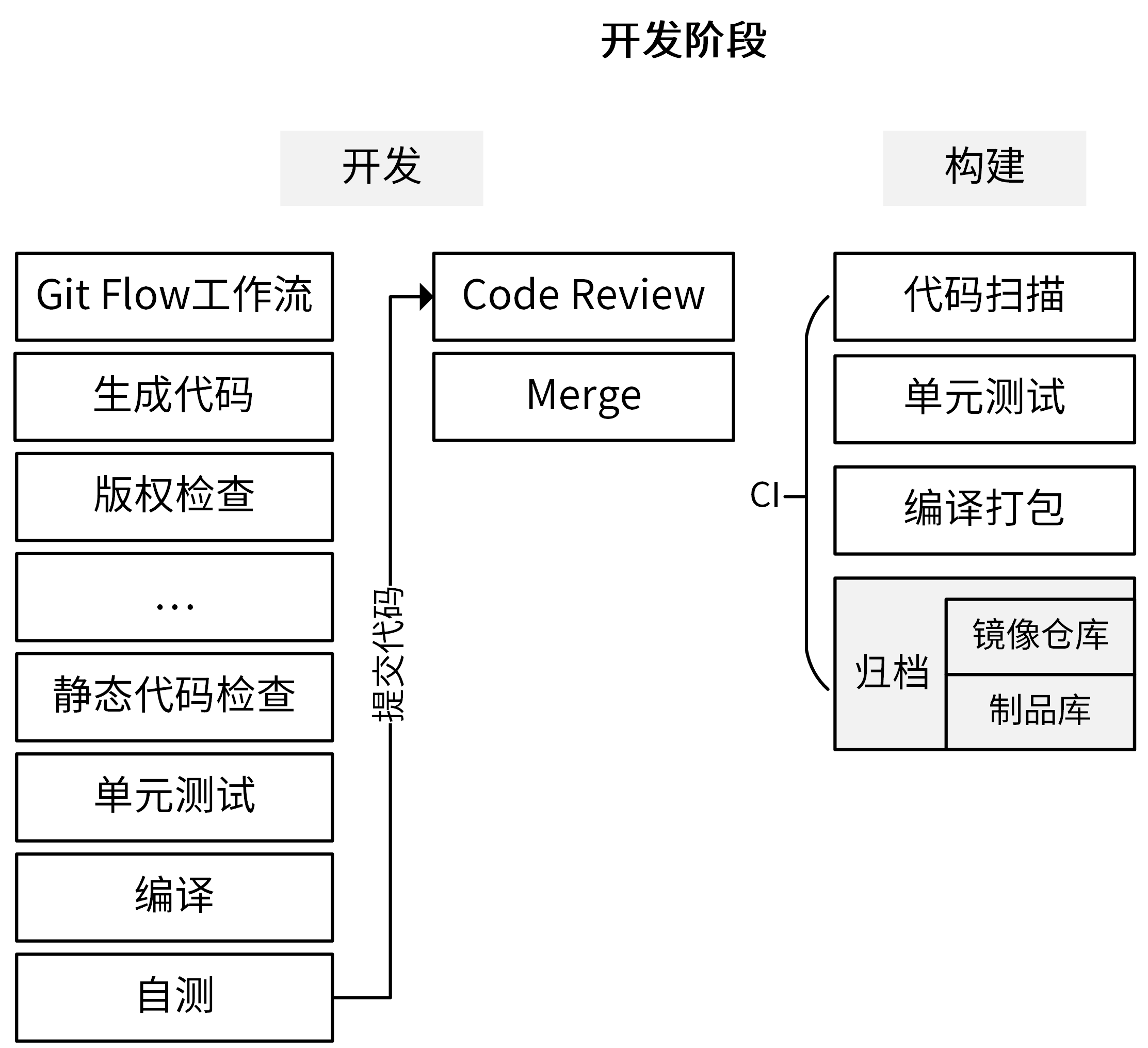 让我们来详细看下这张图里呈现的步骤。开发阶段又可以分为“开发”和“构建”两部分,我们先来看开发。