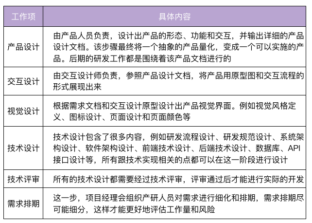 除此之外,在这个阶段一些设计项可以并行,以缩短设计阶段的耗时。例如,产品设计和技术设计可以并行展开。另外,如果你们团队有测试人员,研发阶段最好也拉上测试人员旁听下,有利于后面的测试。