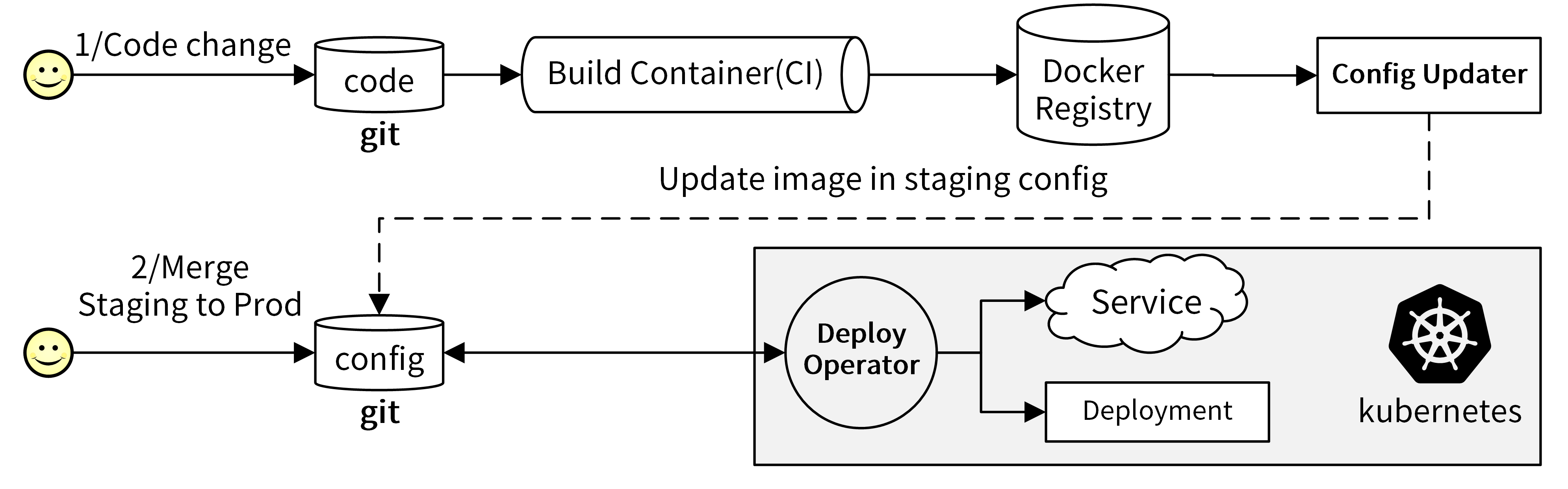然后,GitOps的Deploy Operator服务,检测到YAML文件的变动,会重新从Git仓库中提取变更的文件,并将镜像部署到Kubernetes集群中。Config Updater 和 Deploy Operator 两个组件需要开发人员设计开发。