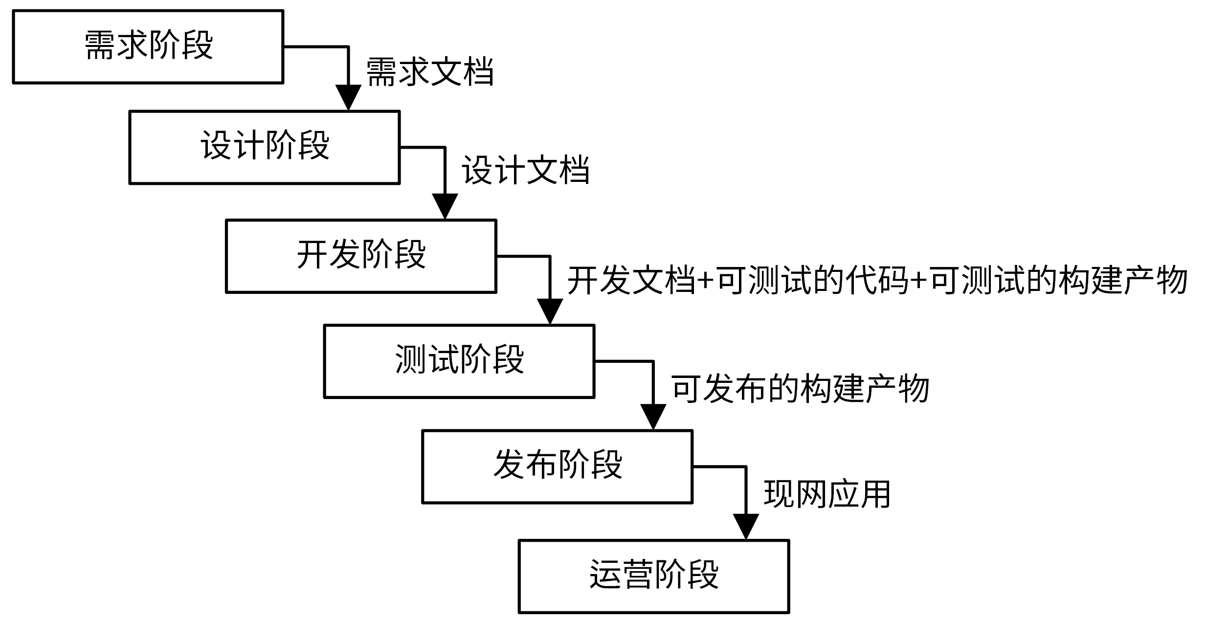 瀑布模式按照预先规划好的研发阶段来推进研发进度。比如,按照需求阶段、设计阶段、开发阶段、测试阶段、发布阶段、运营阶段的顺序串行执行开发任务。每个阶段完美完成之后,才会进入到下一阶段,阶段之间通过文档进行交付。整个过程如下图所示。