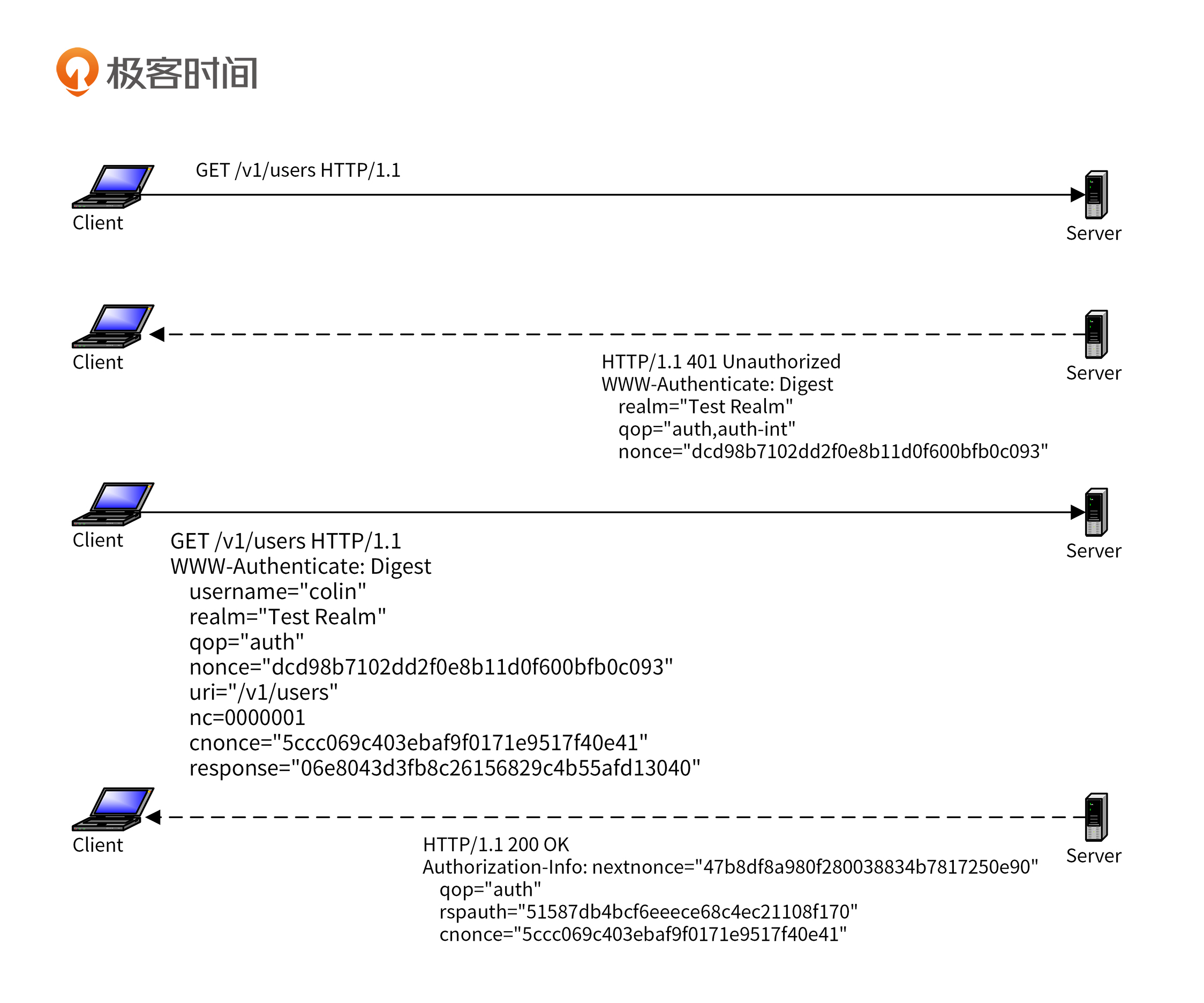 虽然使用摘要可以避免密码以明文方式发送,一定程度上保护了密码的安全性,但是仅仅隐藏密码并不能保证请求是安全的。因为请求(包括密码摘要)仍然可以被截获,这样就可以重放给服务器,带来安全问题。