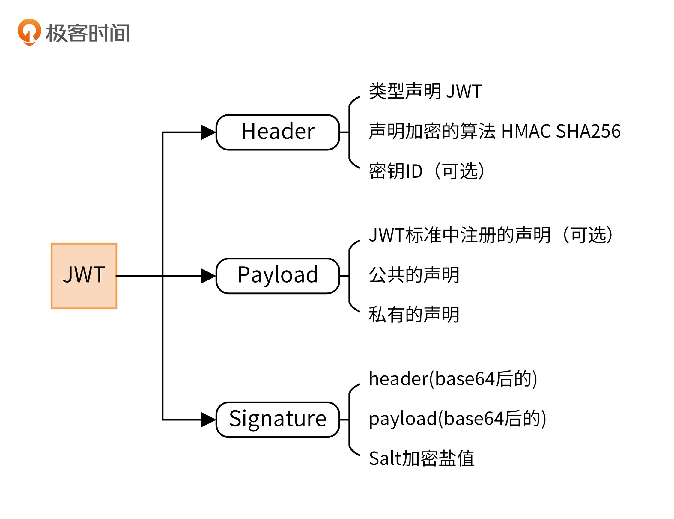 当前最流行的token编码方式是JSON Web Token(JWT,音同 jot,详见 JWT RFC 7519)。接下来,我通过讲解JWT认证来帮助你了解Bearer认证的原理。