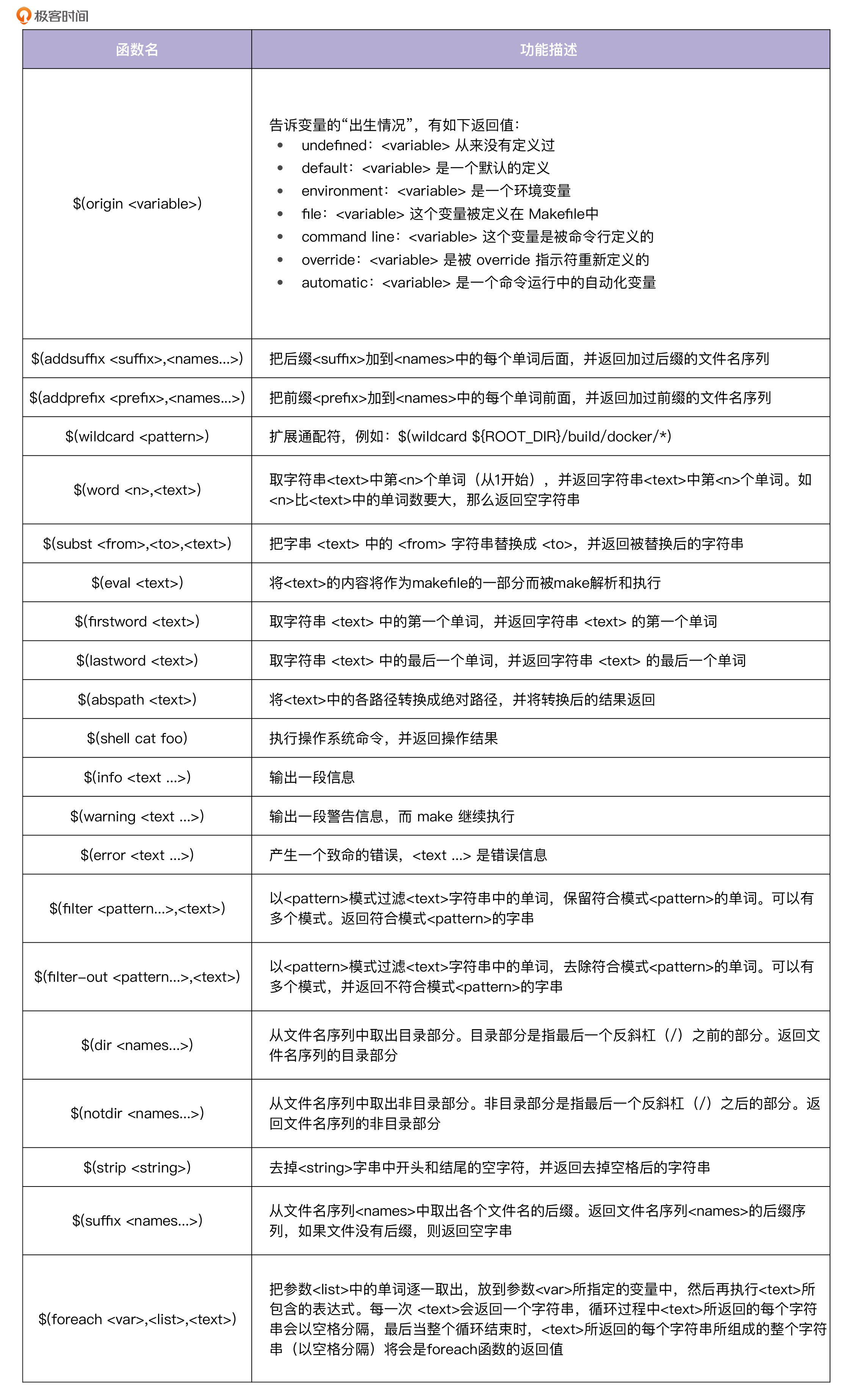 再来看下预定义函数。 刚才提到,make编译器也定义了很多函数,这些函数叫作预定义函数,调用语法和变量类似,语法为: