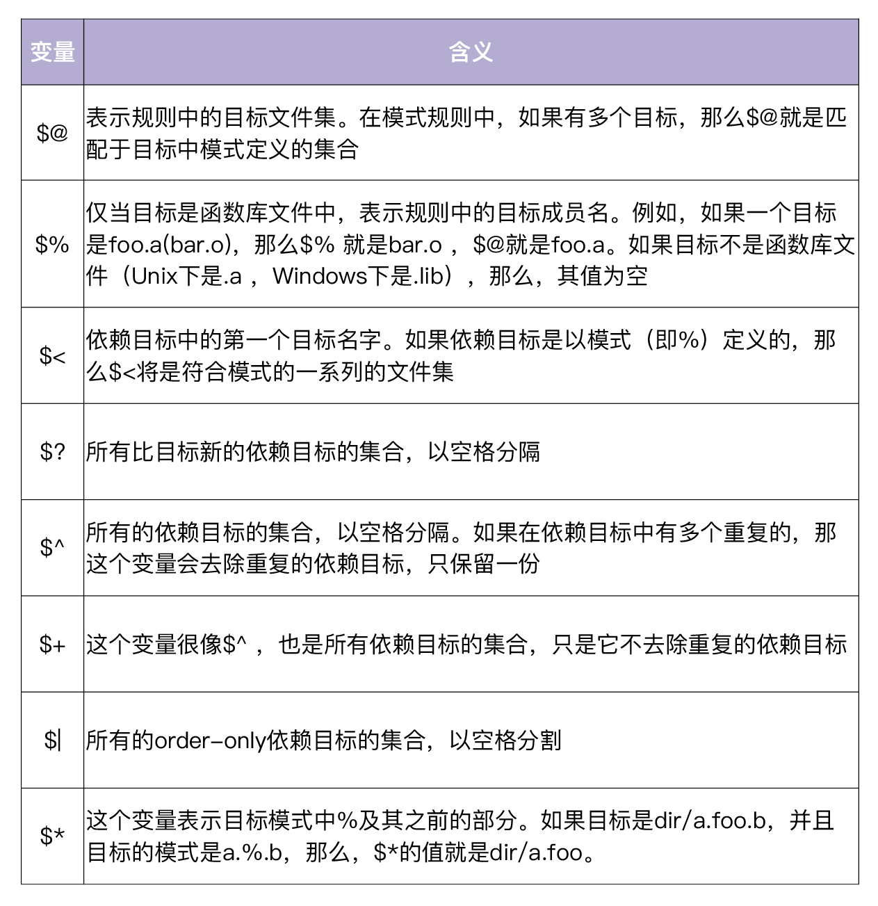 此外,Makefile还支持两种内置的变量:特殊变量和自动化变量。