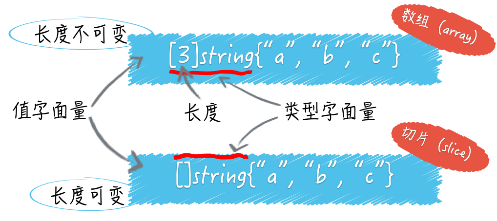 不过,它们最重要的不同是:数组类型的值(以下简称数组)的长度是固定的,而切片类型的值(以下简称切片)是可变长的。