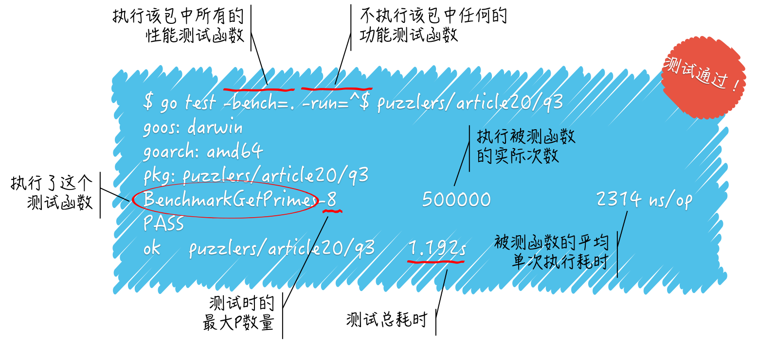我在运行go test命令的时候加了两个标记。第一个标记及其值为-bench=.,只有有了这个标记,命令才会进行性能测试。该标记的值.表明需要执行任意名称的性能测试函数,当然了,函数名称还是要符合Go程序测试的基本规则的。