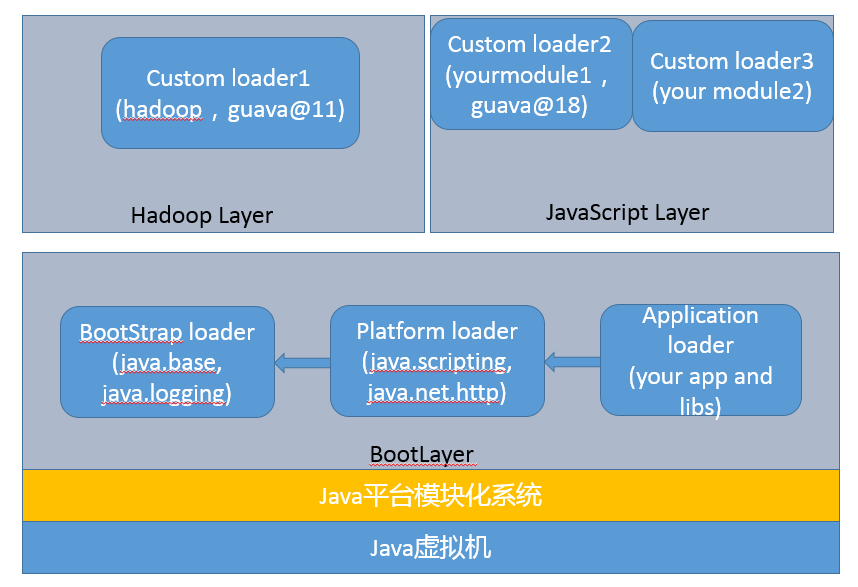 结合了 Layer,目前的 JVM 内部结构就变成了下面的层次,内建类加载器都在 BootLayer 中,其他 Layer 内部有自定义的类加载器,不同版本模块可以同时工作在不同的 Layer。