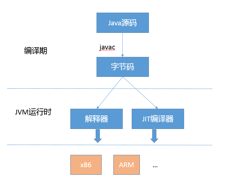 我在【专栏第 1 讲】就已经提到过,Java 通过引入字节码这种中间表达方式,屏蔽了不同硬件的差异,由 JVM 负责完成从字节码到机器码的转化。