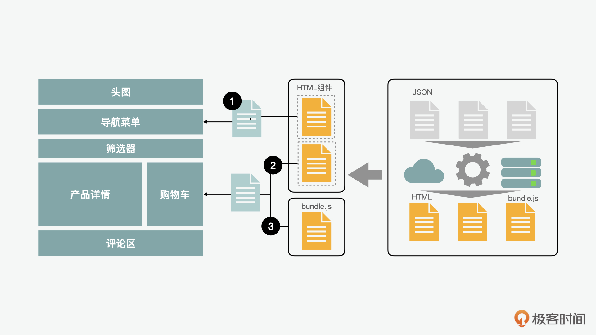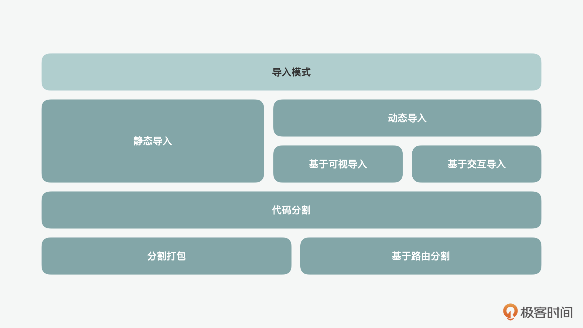 为了配合上述的渲染模式,自然需要一系列的加载模式。对于静态内容,就通过静态倒入;动态的内容则通过动态倒入。基于渐进的思想,我们也可以在部分内容活动到特定区域或者交互后,将需要展示的内容渐进地导入。被导入的内容可以通过分割打包(bundle splitting),根据路径(route based splitting)来做相关组件或资源的加载。