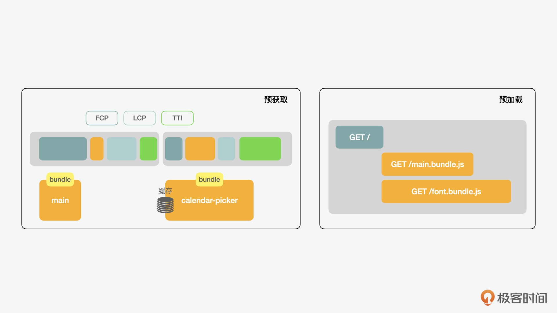 在说到加载的时候,还有一个我们需要注意的概念就是,pre-fetch不等于pre-load。pre-fetch更多指的是预先从服务器端获取,目的是缓存后,便于之后需要的时候能快速加载。而预加载则相反,是加载特别需要在初始化时使用的素材的一种方式,比如一些特殊字体,我们希望预先加载,等有内容加载时能顺滑地展示正确样式的字体。