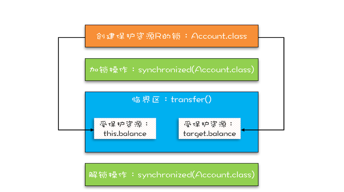 下面这幅图很直观地展示了我们是如何使用共享的锁Account.class来保护不同对象的临界区的。