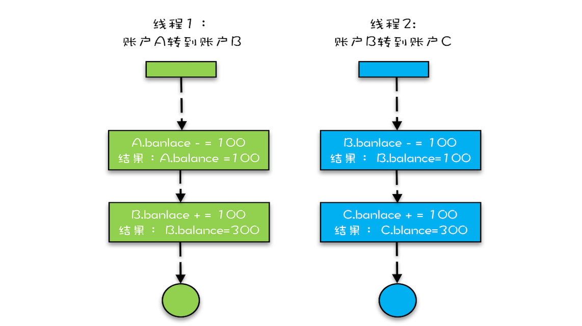 下面我们具体分析一下,假设有A、B、C三个账户,余额都是200元,我们用两个线程分别执行两个转账操作:账户A转给账户B 100 元,账户B转给账户C 100 元,最后我们期望的结果应该是账户A的余额是100元,账户B的余额是200元, 账户C的余额是300元。