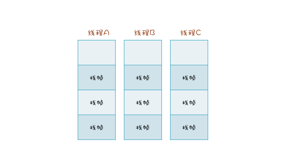 两个线程可以同时用不同的参数调用相同的方法,那调用栈和线程之间是什么关系呢?答案是:每个线程都有自己独立的调用栈。因为如果不是这样,那两个线程就互相干扰了。如下面这幅图所示,线程A、B、C每个线程都有自己独立的调用栈。