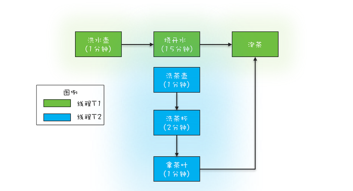 记得以前初中语文课文里有一篇著名数学家华罗庚先生的文章《统筹方法》,这篇文章里介绍了一个烧水泡茶的例子,文中提到最优的工序应该是下面这样: