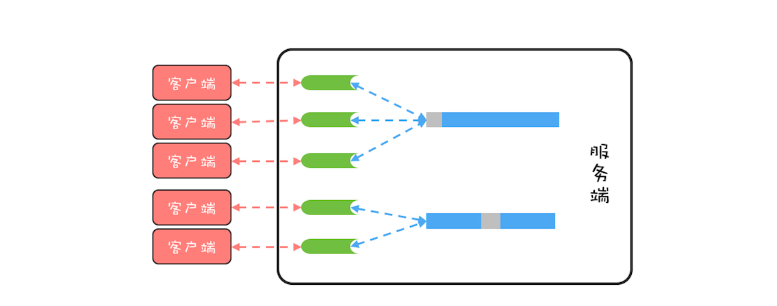 顺着这个思路,我们可以将线程模型优化为下图这个样子,可以用一个线程来处理多个连接,这样线程的利用率就上来了,同时所需的线程数量也跟着降下来了。这个思路很好,可是使用BIO相关的API是无法实现的,这是为什么呢?因为BIO相关的socket读写操作都是阻塞式的,而一旦调用了阻塞式API,在I/O就绪前,调用线程会一直阻塞,也就无法处理其他的socket连接了。
