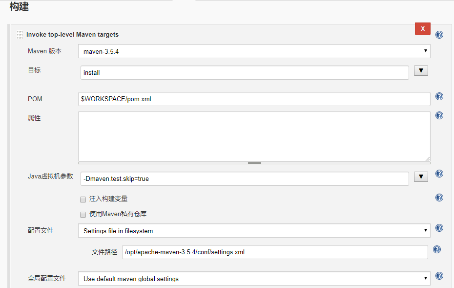 POM 为编译代码时的pom.xml文件,该文件定义了项目的基本信息,用于描述项目如何构建,声明项目依赖等。这里可以写该文件的绝对路径,也可以写相对路径,上面示例配置的为${WORKSPACE}变量(jenkins自带的环境变量)路径下的pom.xml,也就是本项目工作目录下的pom.xml文件,所以这里也可以直接写pom.xml而不加任何路径。