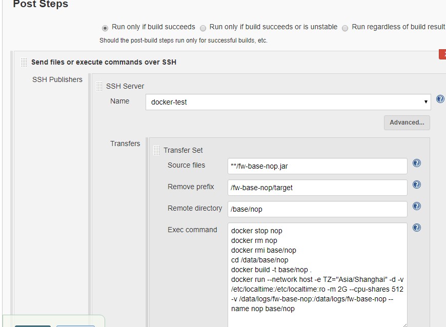 exec command表示在远程服务器上执行shell命令,此处的命令是一行一行执行的,并且上一条命令执行出错并不影响下条命令的执行,但是如果这些命令是有依赖关系的(比如下条命令依赖上条命令),会导致部署失败。这里为了方便测试和学习,先将命令一行一行写出来,也可以将上面的命令写成一个脚本,然后通过执行脚本去部署服务。