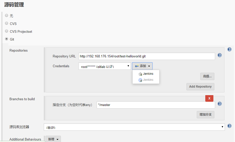 使用freestyle类型的job配置如下,在源码管理步骤中使用git服务。