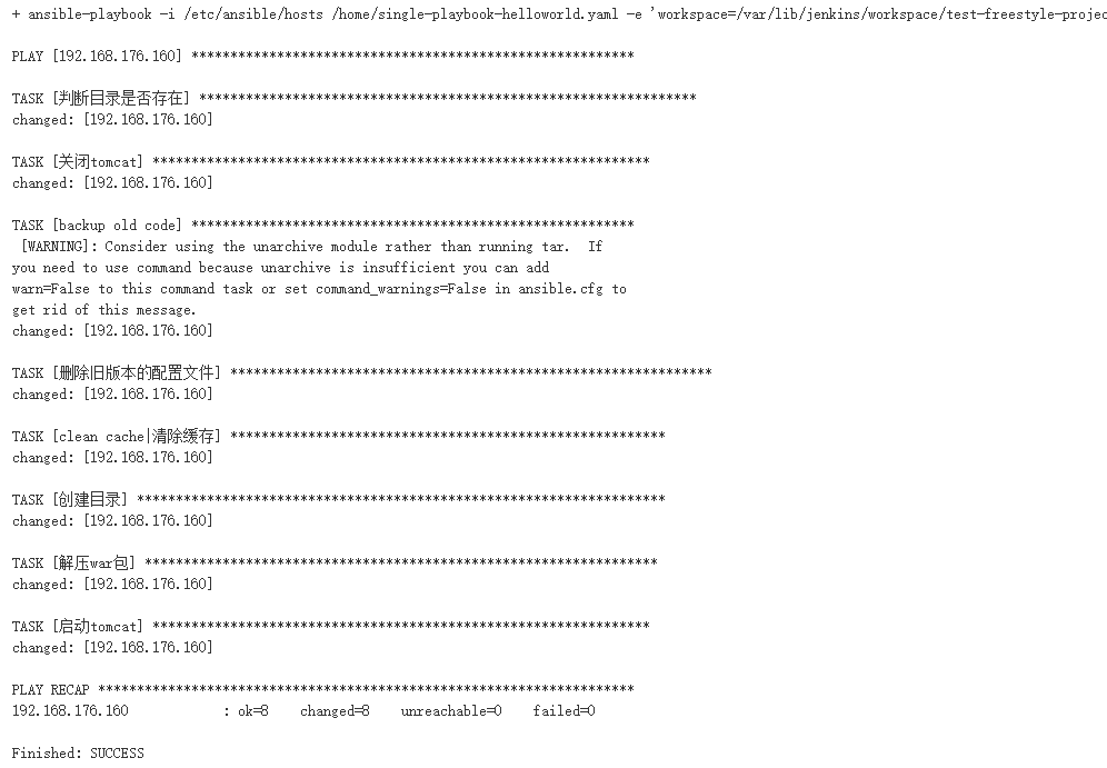 上面示例使用ansible-playbook将在jenkins里执行的命令进行了重写,拉取代码和代码编译配置没有变。