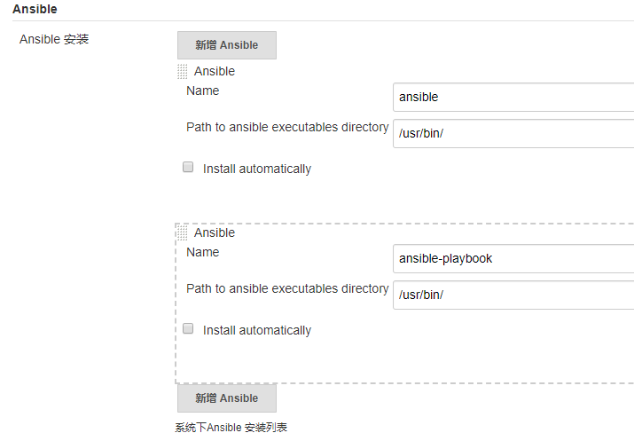 Ansible installation 用来选择ansible的命令,此处的命令获取方式为一个下拉列表,该列表的值是从Jenkins的全局工具中配置ansible相关命令的环境变量获取到的,在前面的章节中我们已经做过此操作,如果没有的话,需要重新添加ansible的环境变量,比如我这里在Jenkins中配置的ansible命令的环境变量如下: