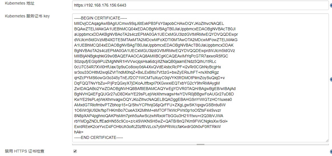 Kubernetes 服务证书 key:用于填写与kubernetes集群认证的证书内容。