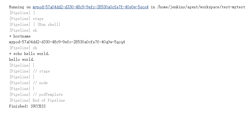 node中直接使用”label”便可以引用上面定义的label变量,表示在该pod名称中执行命令,如果不指定的话,默认还是在Jenkins服务所在主机上执行流水线脚本。