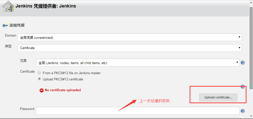 如上图所指示,凭据类型为”Certiticate“,password为生成证书时的设置的密码。