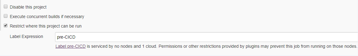 同时,在使用其他类型(比如 自由风格类型、maven类型)的job时也能够使用该PodTemplate方法,用于动态生成slave。比如创建一个自由风格类型的job,配置job时勾选 Restrict where this project can be run ,在显示的Label Expression 输入框里输入我们上边配置PodTemplate时设定的标签(Labels) 名称 pre-CICD即可。