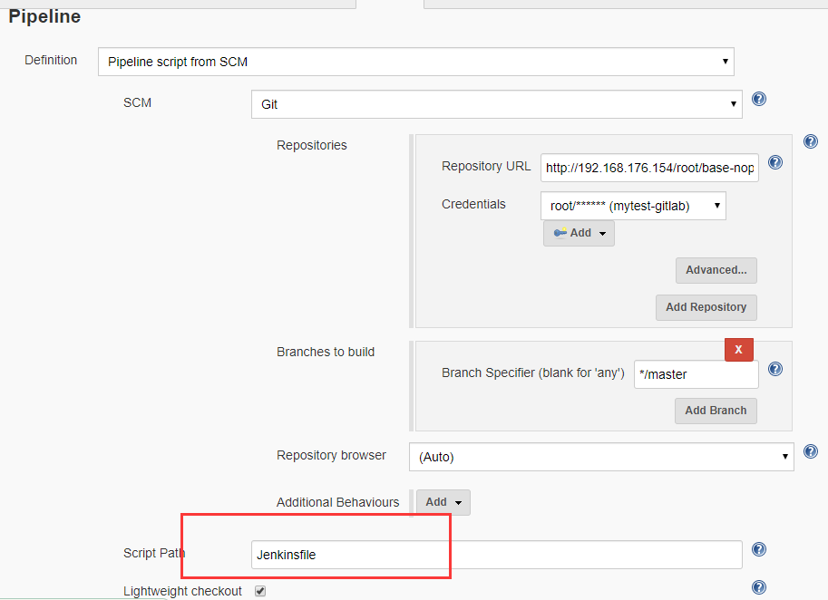 checkout([$class: 'GitSCM', branches: [[name: '*/master']], doGenerateSubmoduleConfigurations: false, userRemoteConfigs: [[credentialsId: 'c33d60bd-67c6-4182-b52c-d7aeebfab772', url: 'http://192.168.176.154/root/base-nop.git']]])