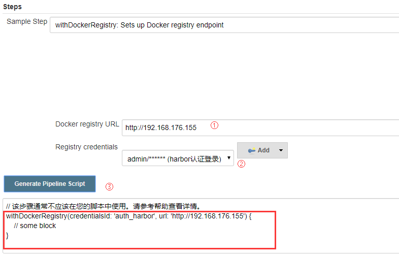 withDockerRegistry(credentialsId: 'auth_harbor', url: 'http://192.168.176.155') {