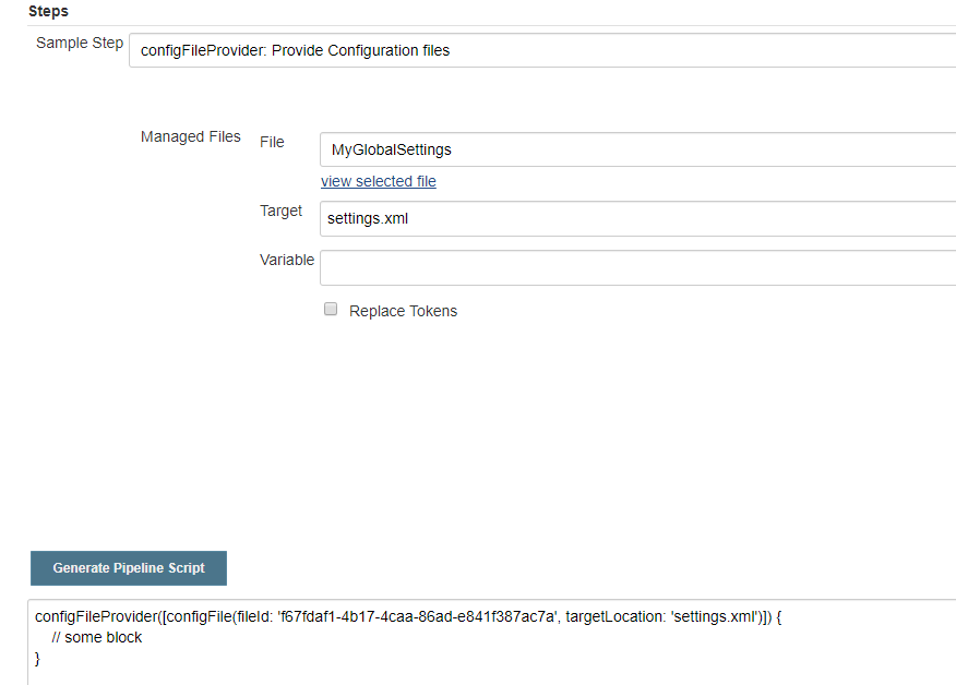 然后使用片段生成器configfileProvider:...根据配置的maven settings.xml文件生成语法片段,比如: