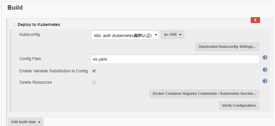 在普通类型(比如自由风格类型、maven类型)的Job中,配置Job时使用”Add build step(添加构建步骤)”选项,从列出的选项列表中选择”Deploy to kubernetes“。