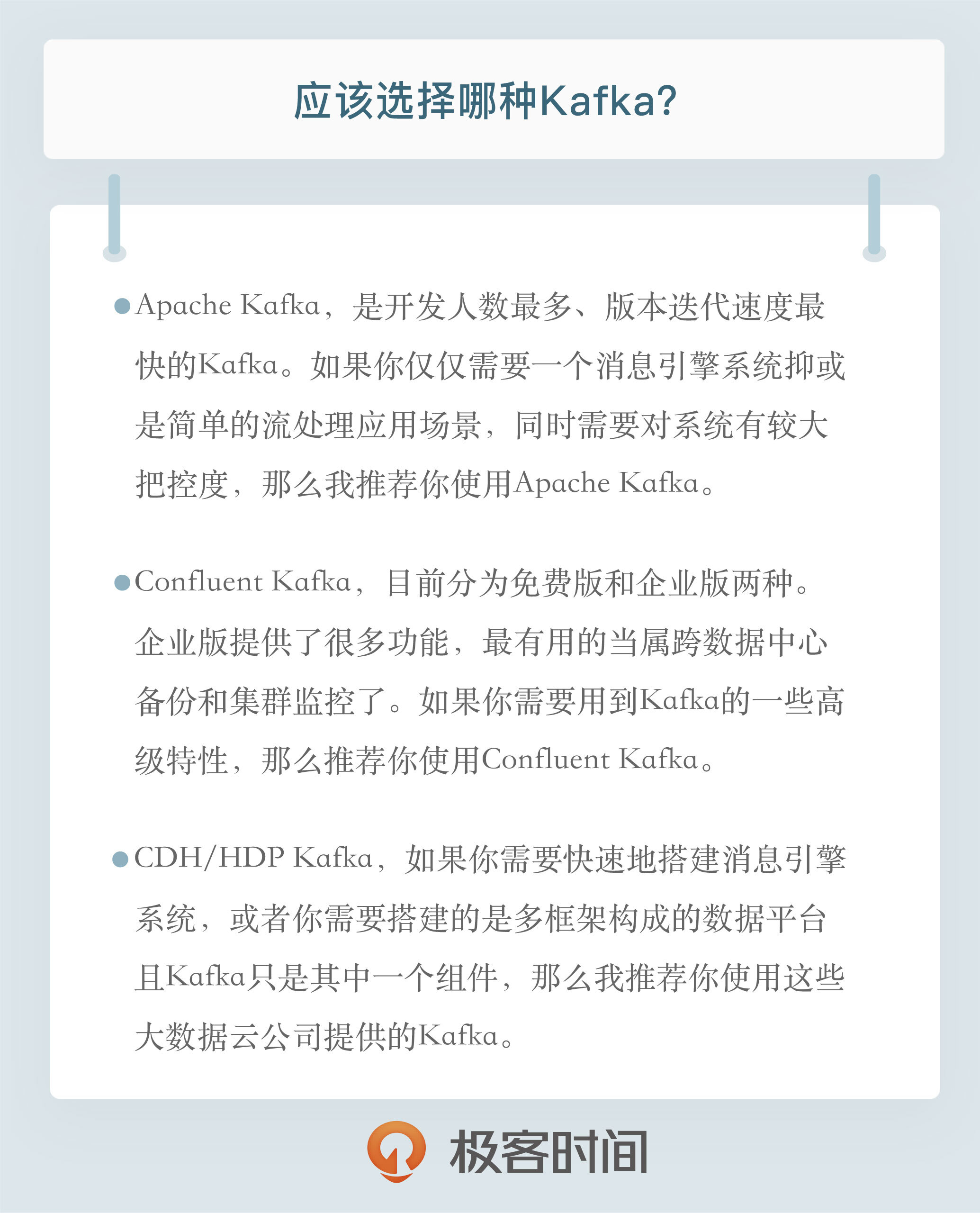 总结一下,我们今天讨论了不同的Kafka“发行版”以及它们的优缺点,根据这些优缺点,我们可以有针对性地根据实际需求选择合适的Kafka。下一期,我将带你领略Kafka各个阶段的发展历程,这样我们选择Kafka功能特性的时候就有了依据,在正式开启Kafka应用之路之前也夯实了理论基础。